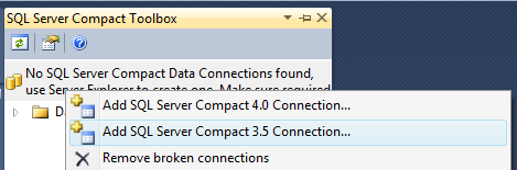 In this post, we will discuss Option 3. I want to show how the free SQL Server Compact Toolkit can add a database.